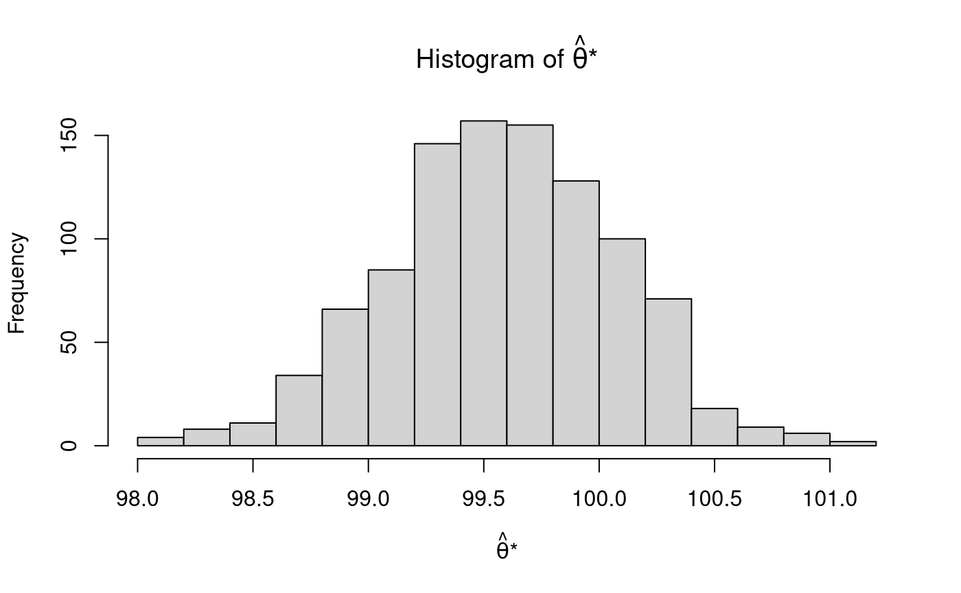 \[\begin{equation} \hat{\theta}^{*} \left( \cdot \right) = \frac{1}{B} \sum_{b = 1}^{B} \hat{\theta}^{*} \left( b \right) = 99.5814296 . \end{equation}\]
