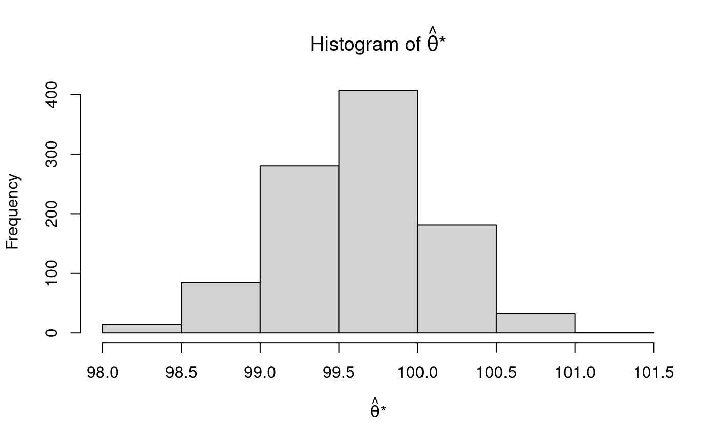 thetahatstar <- sapply( X = xstar, FUN = mean ) str(thetahatstar) #> num [1:1000] 99.5 99.6 99.3 99.4 100 ...