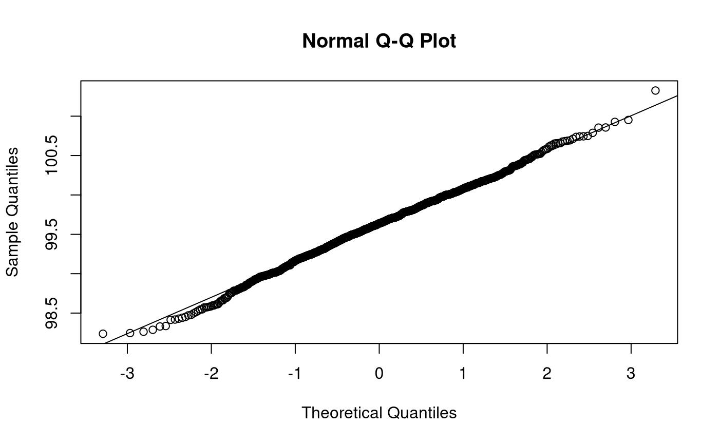 In parametric bootstrapping we make a parametric assumption about the distribution of \(\hat{F}\), that is, \(\hat{F} = F_{\hat{\theta}}\) . In the current example, we assume a normal distribution \(\mathcal{N} \left( \mu, \sigma^2 \right)\). Data is generated \(B\) number of times (1000 in the current example) from the empirical distribution \(\hat{F}_{\mathcal{N} \left( \hat{\mu}, \hat{\sigma^2} \right)}\) using parameter estimates (\(\hat{\mu} = 99.6126336\) and \(\hat{\sigma}^2 = 226.1359868\)).