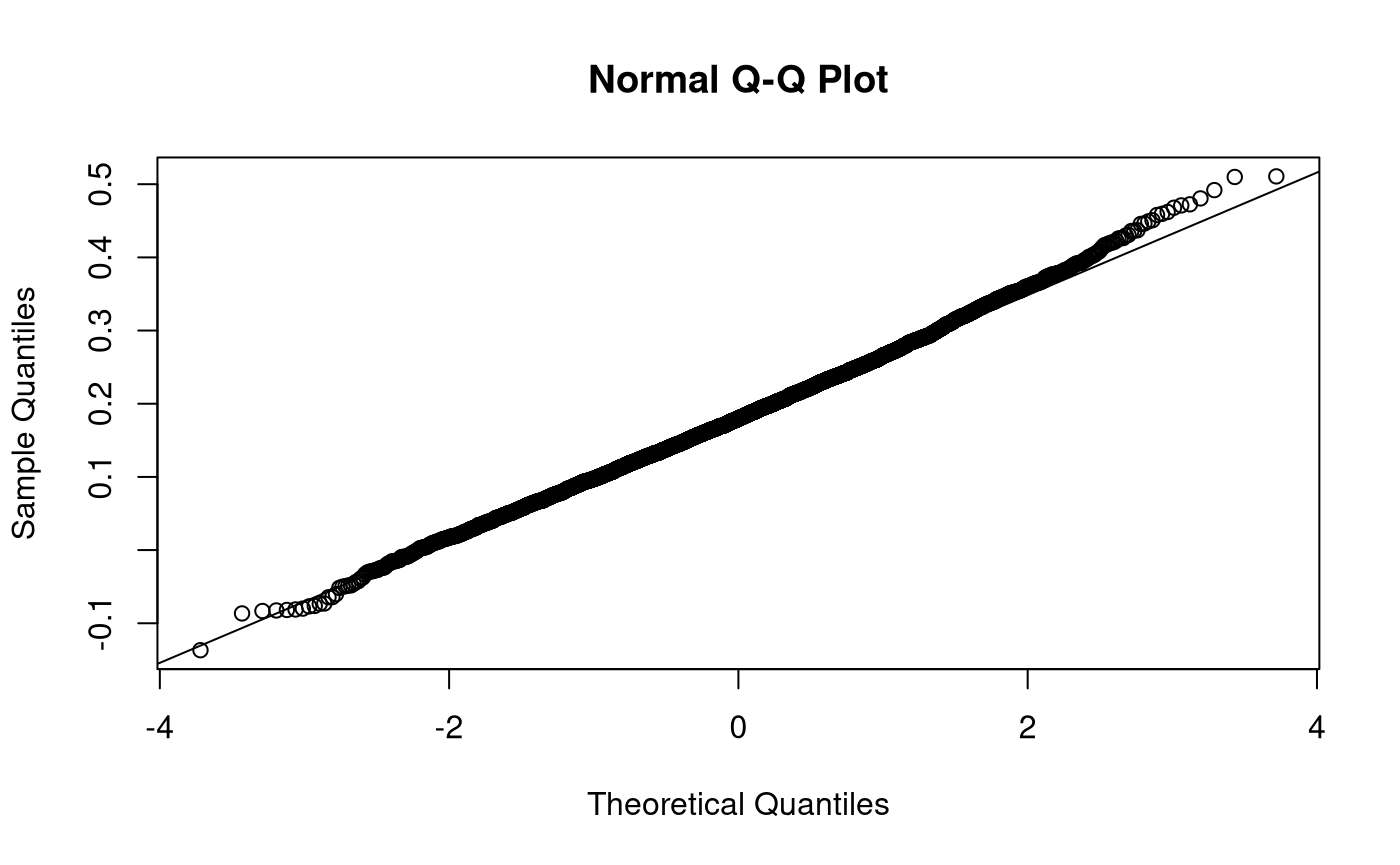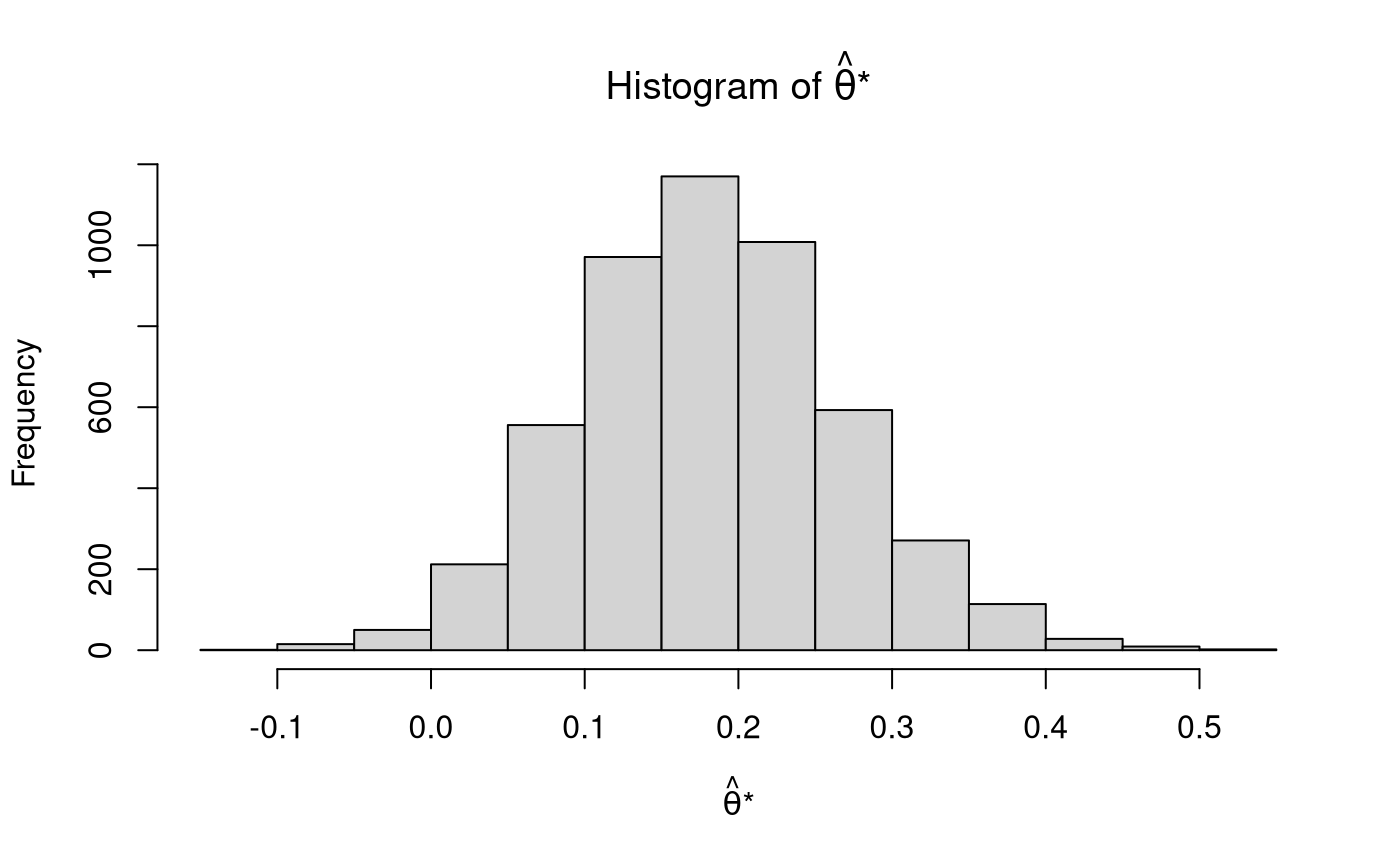 \[\begin{equation} \widehat{\mathrm{se}}_{\mathrm{B}} \left( \hat{\theta} \right) = \sqrt{ \frac{1}{B - 1} \sum_{b = 1}^{B} \left[ \hat{\theta}^{*} \left( b \right) - \hat{\theta}^{*} \left( \cdot \right) \right]^2 } = 0.0855372 \end{equation}\]