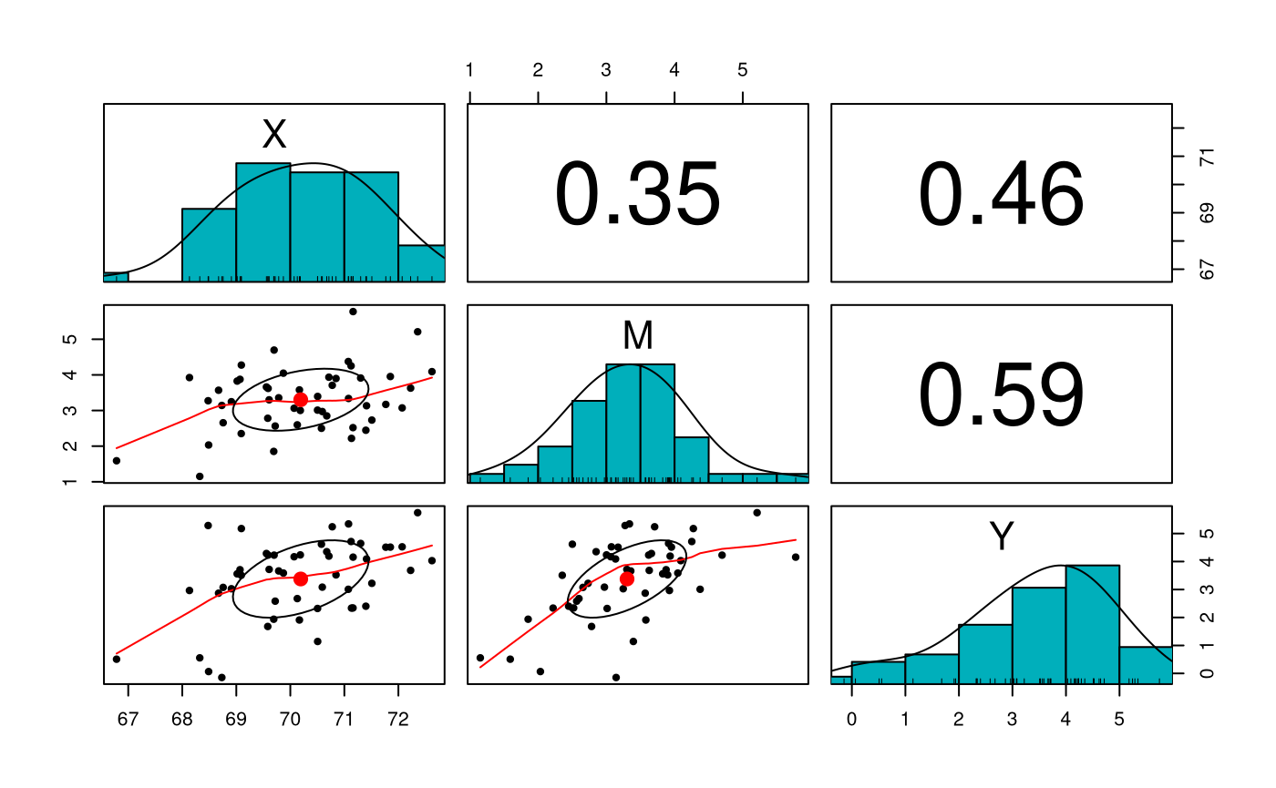 X <- as.data.frame( mvrnorm( n = n, Sigma = Sigmatheta, mu = mutheta ) ) str(X) #> 'data.frame': 50 obs. of 3 variables: #> $ X: num 69.6 72.1 68.7 68.1 70.6 ... #> $ M: num 2.78 3.07 3.14 3.92 2.97 ... #> $ Y: num 1.678 4.526 -0.146 2.965 3.084 ...