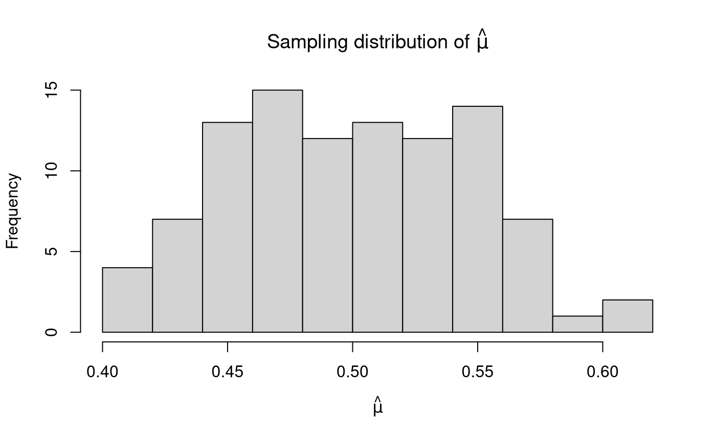 str(thetahatstar) #> num [1:100, 1] 0.48 0.41 0.45 0.55 0.61 0.54 0.5 0.48 0.52 0.47 ... hist(thetahatstar, main = expression("Sampling distribution of" ~ hat(mu)), xlab = expression(hat(mu)) )