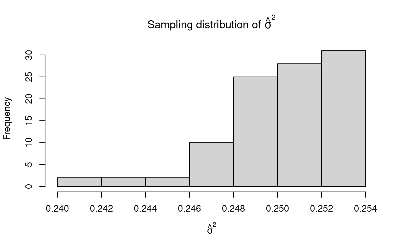 str(thetahatstar) #> num [1:100, 1] 0.252 0.244 0.25 0.25 0.24 ... hist(thetahatstar, main = expression("Sampling distribution of" ~ hat(sigma)^2), xlab = expression(hat(sigma)^2) )