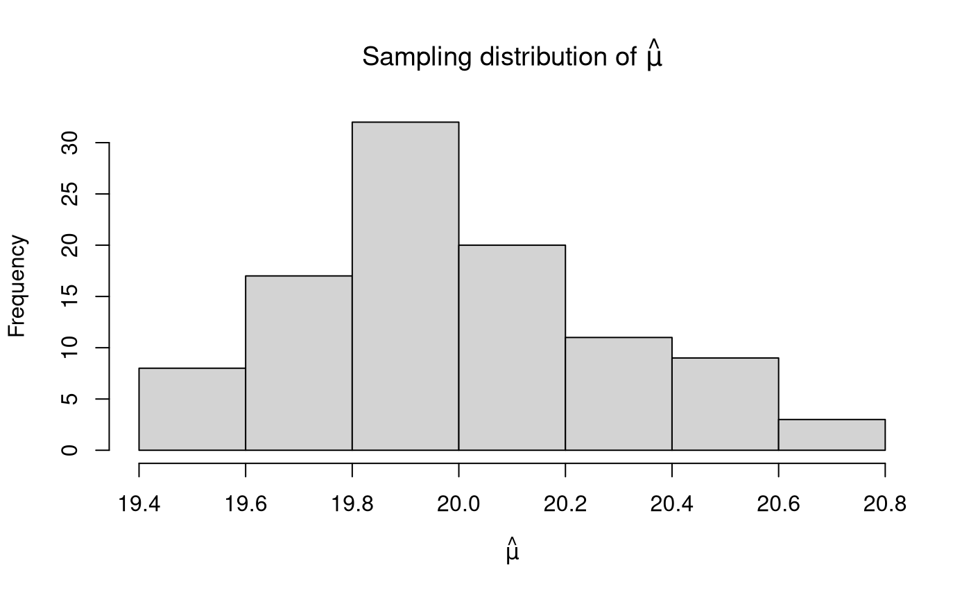 str(thetahatstar) #> num [1:100, 1] 19.9 19.9 20.2 19.9 20 ... hist(thetahatstar, main = expression("Sampling distribution of" ~ hat(mu)), xlab = expression(hat(mu)) )