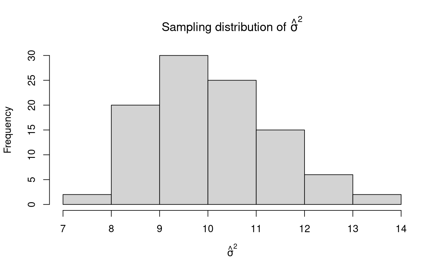 str(thetahatstar) #> num [1:100, 1] 12.68 11.58 8.61 10.23 12 ... hist(thetahatstar, main = expression("Sampling distribution of" ~ hat(sigma)^2), xlab = expression(hat(sigma)^2) )