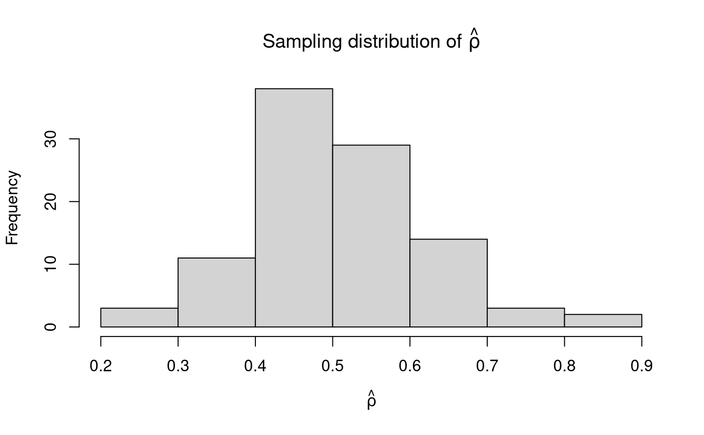 thetahatstar <- thetahatstar[, 2] str(thetahatstar) #> num [1:100] 0.36 0.37 0.472 0.488 0.592 ... hist(thetahatstar, main = expression("Sampling distribution of" ~ hat(rho)), xlab = expression(hat(rho)) )