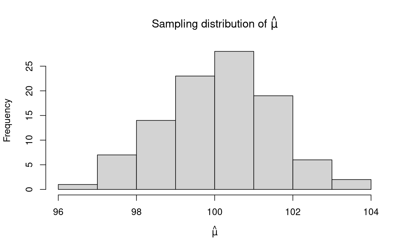 str(thetahatstar) #> num [1:100, 1] 99.7 101 99.6 98.1 100.9 ... hist(thetahatstar, main = expression("Sampling distribution of" ~ hat(mu)), xlab = expression(hat(mu)) )