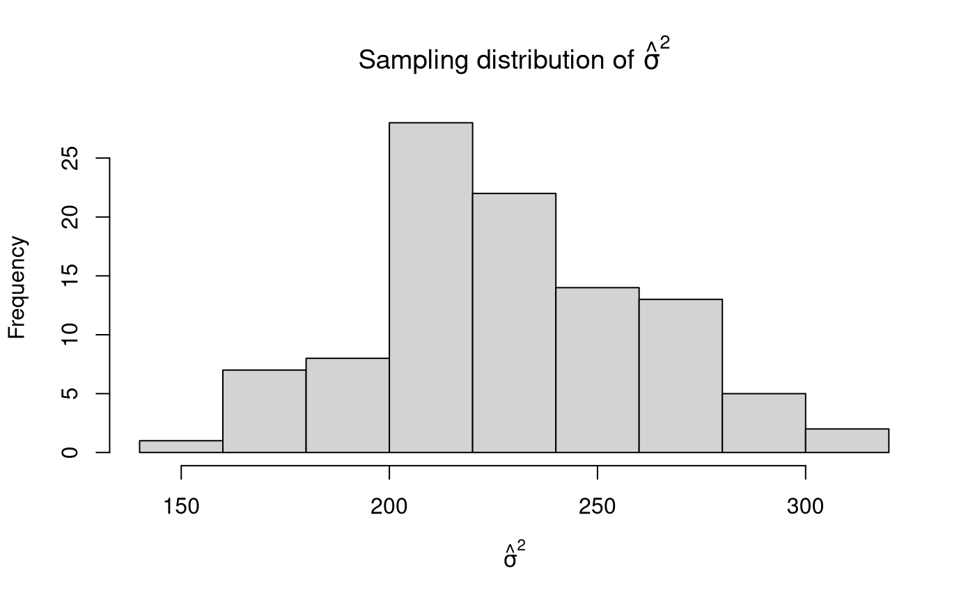 str(thetahatstar) #> num [1:100, 1] 251 234 249 283 303 ... hist(thetahatstar, main = expression("Sampling distribution of" ~ hat(sigma)^2), xlab = expression(hat(sigma)^2) )