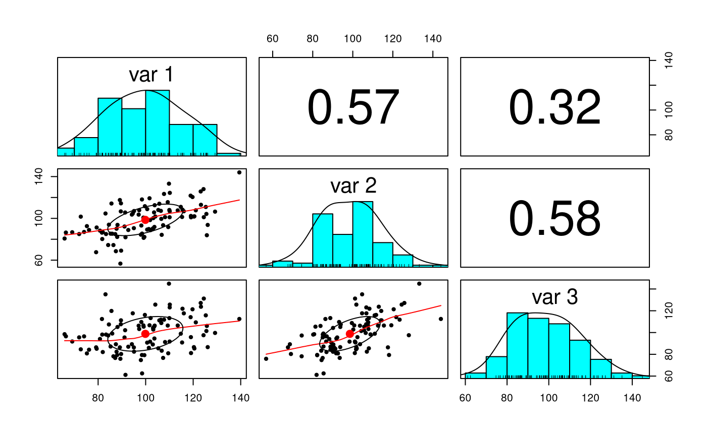 str(X) #> num [1:100, 1:3] 105.8 109.3 119.7 91.5 101.9 ... #> - attr(*, "dimnames")=List of 2 #> ..$ : NULL #> ..$ : NULL psych::pairs.panels(X)