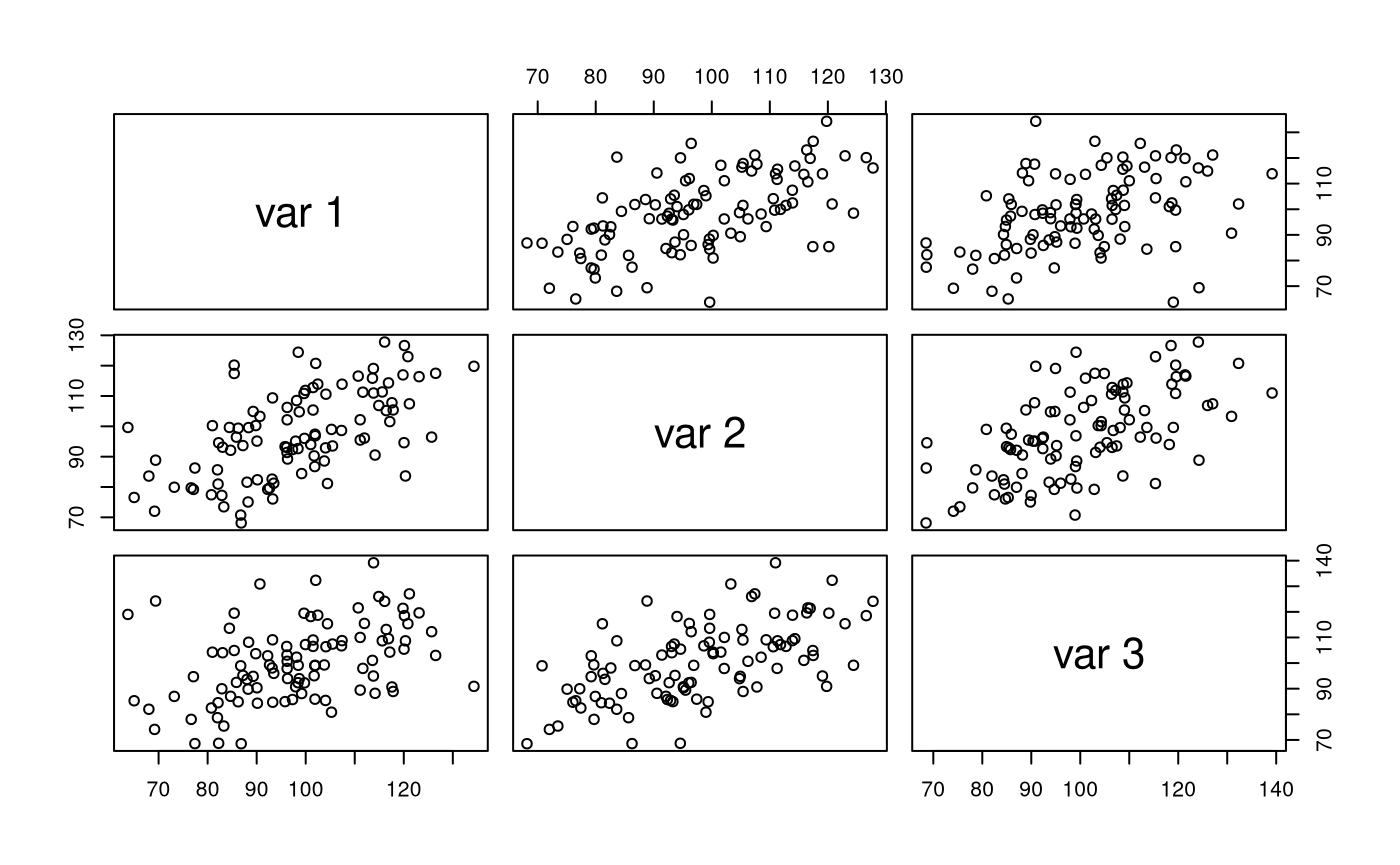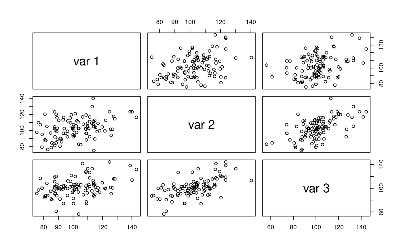 str(X) #> num [1:100, 1:3] 102 77.1 73.2 96.2 81 ... #> - attr(*, "dimnames")=List of 2 #> ..$ : NULL #> ..$ : NULL pairs(X)