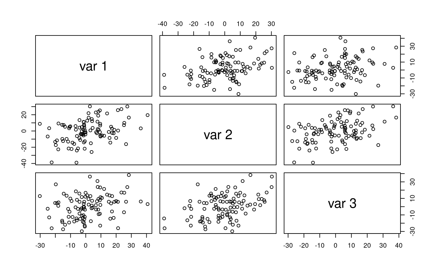 str(X) #> num [1:100, 1:3] -1.48 27.37 -6.1 2.75 4.18 ... #> - attr(*, "dimnames")=List of 2 #> ..$ : NULL #> ..$ : NULL pairs(X)