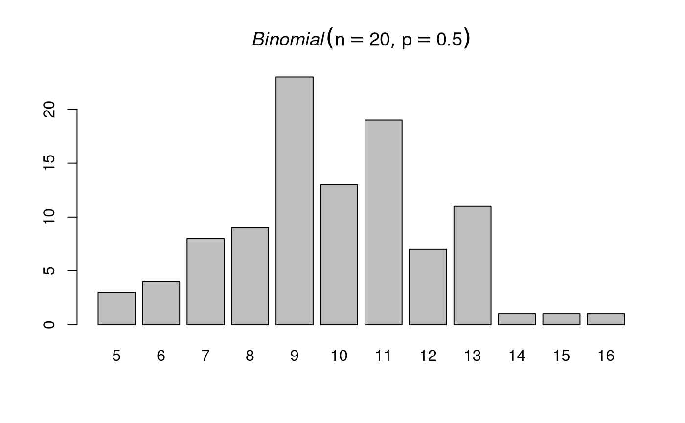 str(x, list.len = 6) #> int [1:100] 9 13 6 9 10 9 7 8 13 11 ... barplot(table(x), main = expression(italic("Binomial")(list(n == 20, p == 0.50))))