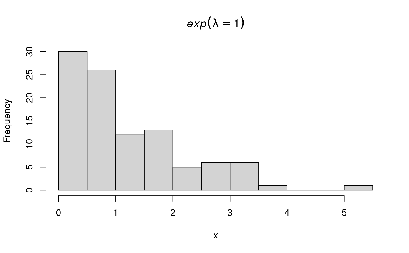 str(x, list.len = 6) #> num [1:100] 0.883 1.319 0.614 0.254 2.704 ... hist(x, main = expression(italic(exp)(lambda == 1)))