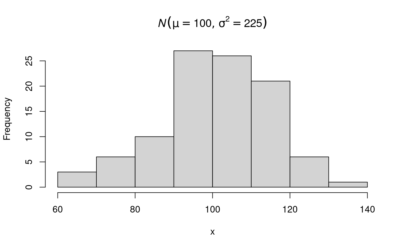 str(x, list.len = 6) #> num [1:100] 108 104.8 114.2 84.8 125.6 ... hist(x, main = expression(italic(N)(list(mu == 100, sigma^2 == 225))))