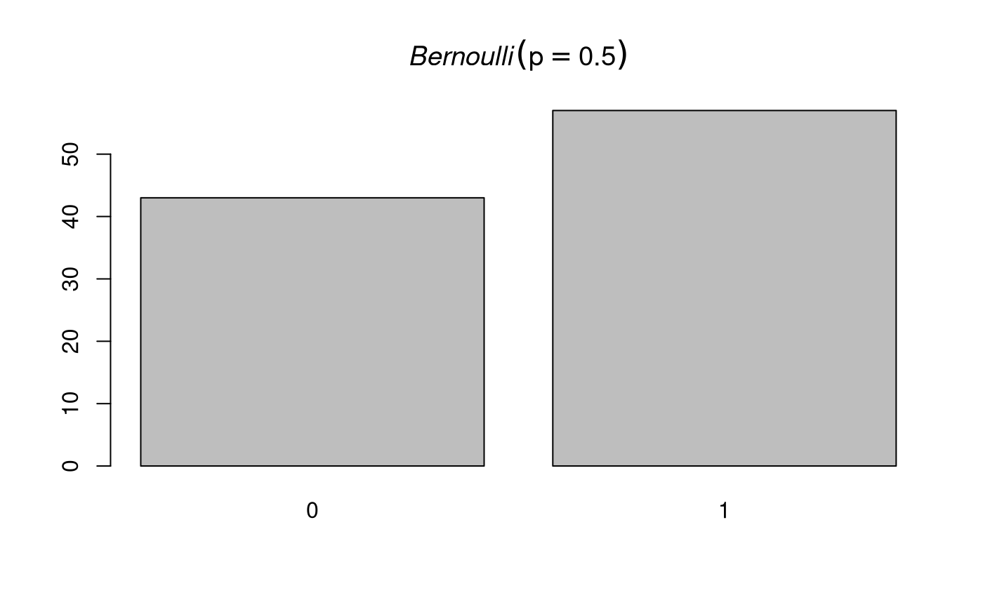 str(x, list.len = 6) #> int [1:100] 0 1 0 0 1 1 1 1 0 0 ... barplot(table(x), main = expression(italic("Bernoulli")(p == 0.50)))