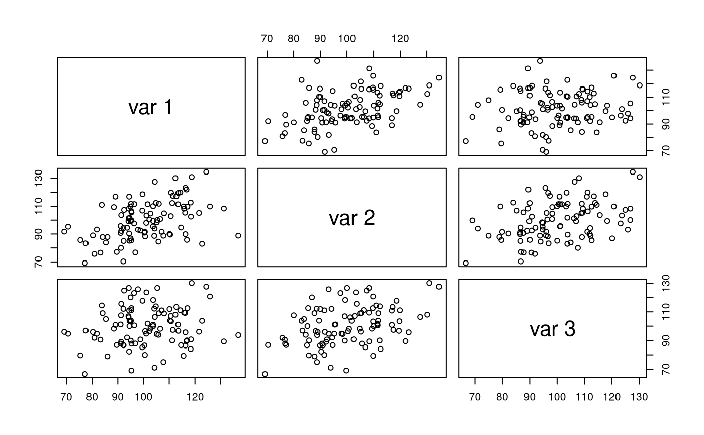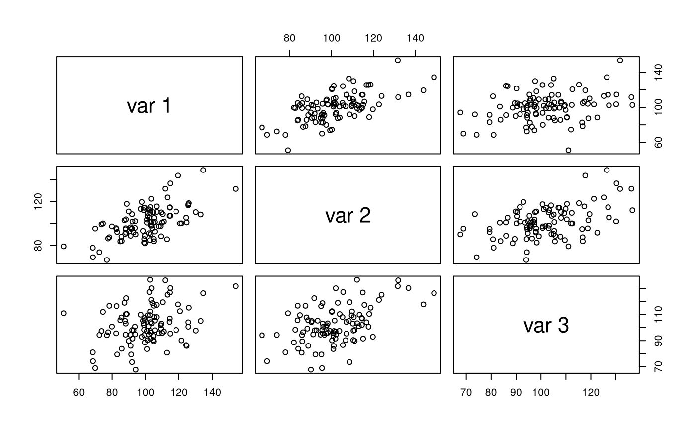 str(X) #> num [1:100, 1:3] 104 91.4 99.5 91.1 109.8 ... #> - attr(*, "dimnames")=List of 2 #> ..$ : NULL #> ..$ : NULL pairs(X)