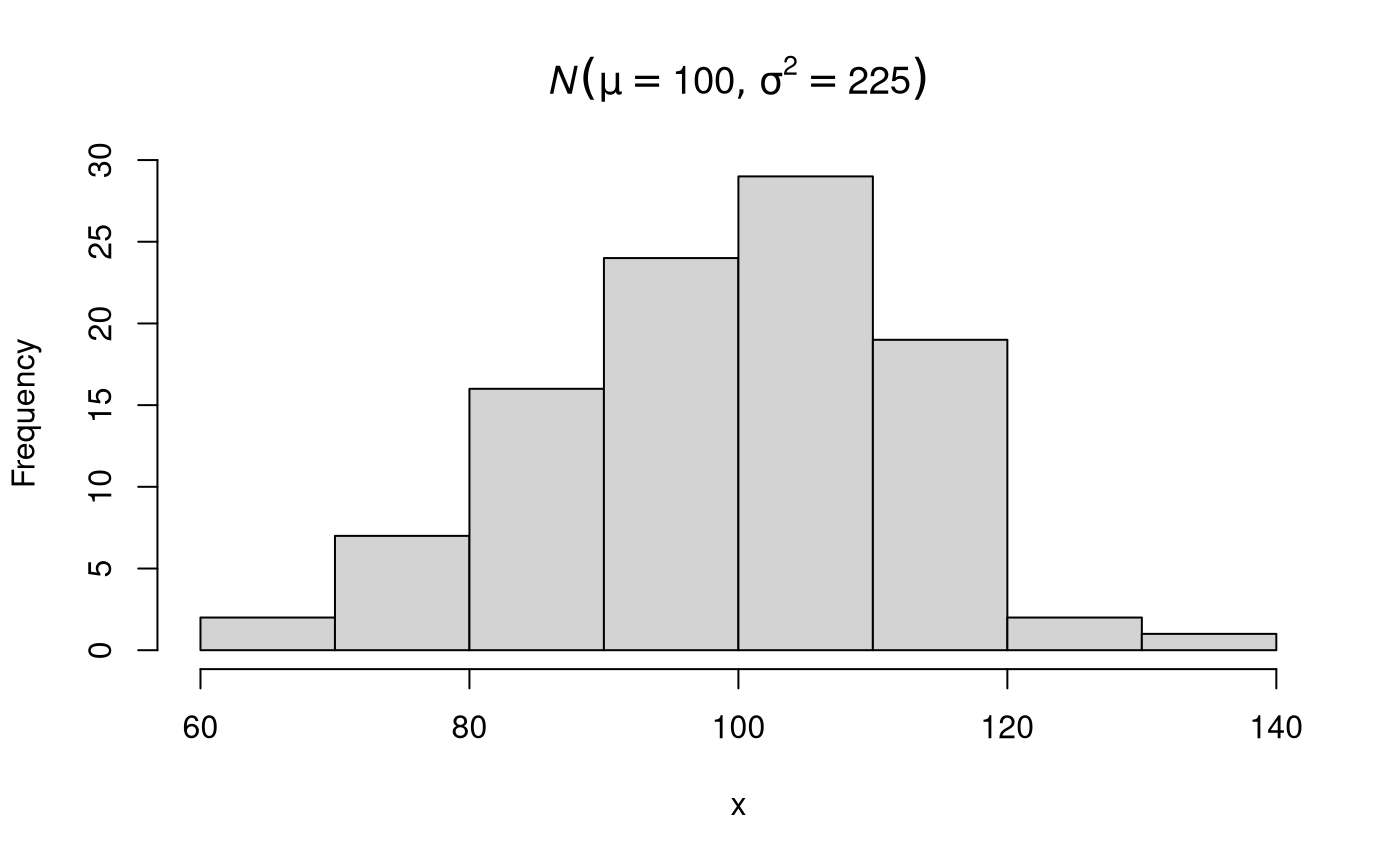 str(x, list.len = 6) #> num [1:100] 107.5 105.5 106.8 109.6 89.7 ... hist(x, main = expression(italic(N)(list(mu == 100, sigma^2 == 225))))
