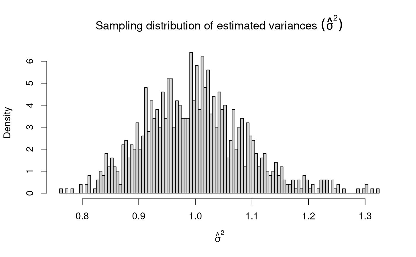 \[\begin{equation} \mathrm{Var} \left( \hat{\sigma}^2 \right) = \frac{ \left( n - 1 \right) \hat{\sigma}^2 }{ \sigma^2 }, \quad \text{where} \quad X \sim \mathcal{N} \left( \mu, \sigma^2 \right) %(\#eq:dist-sampling-dist-var-var) \end{equation}\]