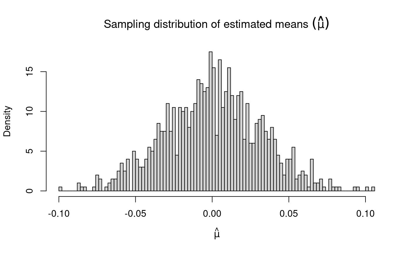 \[\begin{equation} \hat{\mu} \sim \mathcal{N} \left( \mu, \frac{\sigma^2}{n} \right) %(\#eq:dist-sampling-dist-mean) \end{equation}\]