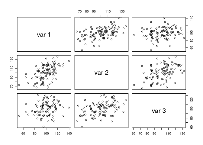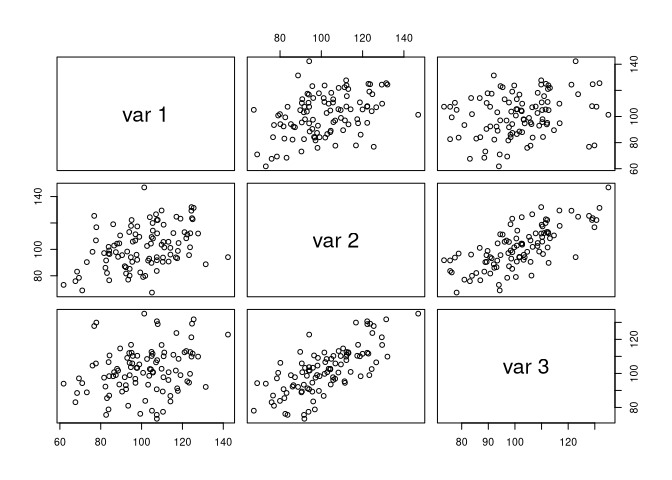 str(X) #> num [1:100, 1:3] 120 106 140 102 106 ... #> - attr(*, "dimnames")=List of 2 #> ..$ : NULL #> ..$ : NULL pairs(X)