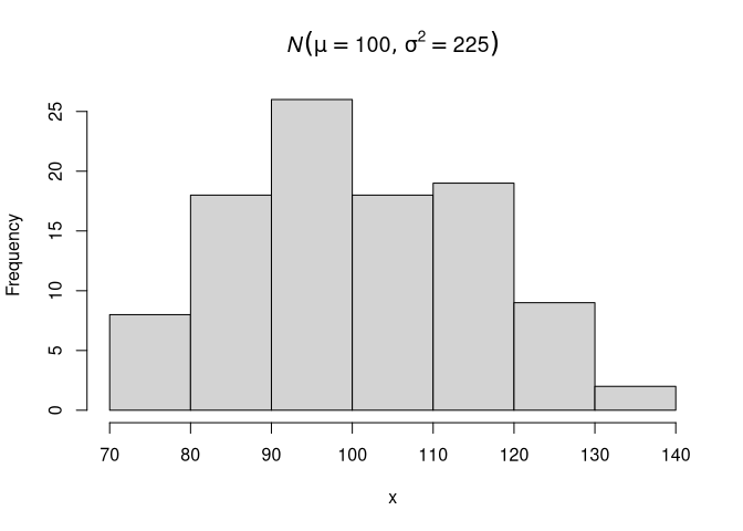 str(x, list.len = 6) #> num [1:100] 98 102.7 77.3 94.1 74.9 ... hist(x, main = expression(italic(N)(list(mu == 100, sigma^2 == 225))))